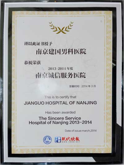 為表彰建國醫院在男科方面的巨大貢獻,南京建國醫院初次榮獲“專業男科醫院”稱號。